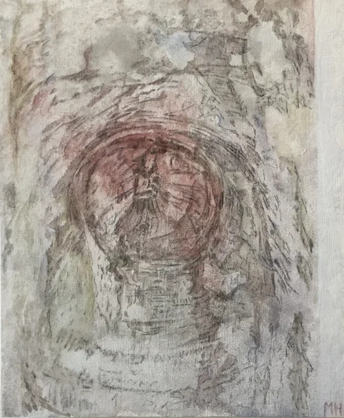 Marie Holmgren tecknar träd. Harmoniskt centrerat i bilden möter betraktaren trädet ansikte mot ansikte. Frikopplade från rötter, luft och omgivning men också frikopplade från det förflutna och det som komma skall framträder de här och nu. Med distinkta blyertsprickar i en tålmodig teknik arbetas det formen fram. Hur starkt trädet tillåts framträda i bildens slutliga valör, förhandlas fram under arbetets gång. Det är i den stilla processen relationen mellan tecknare och objekt utvecklas. Den meditativa atmosfären för tankarna till japanska tuschteckningar i Katsushika Hokusais ( 1760 - 1849 ) bildvärld, fast än det snabba, tveklösa anslaget i hans teckningar är den motsatta hållningen.